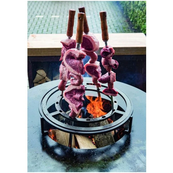 Plutôt que de cuire vos brochettes à l’horizontal, si vous passiez à la verticale ! En possession d’une plancha braséro Ofyr, vous allez pouvoir stabiliser de grandes brochettes garnies de grosses pièces de viande à l’aide de l’anneau Brazil 100.