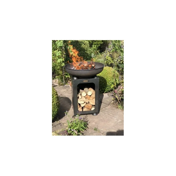 Ce braséro posé sur ce rangement à bois est un foyer à feu ouvert. Il se placera parfaitement dans votre jardin et offrira un design élégant et sophistiqué à votre extérieur.
