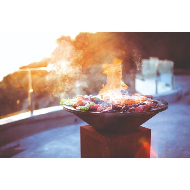 Ce OFYR Classic 100 propose une surface de cuisson plus grande que le modèle en 85, on peut ainsi cuisiner pour 20 personnes en même temps ! Son design convient à tous les environnements, c’est un bel objet design en acier Corten. Le simple fait de l’allumer transforme n’importe quel évènement en une occasion particulière.