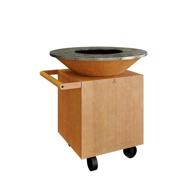 Braséro plancha OFYR 100 Pro : ce modèle est tout simplement une amélioration du premier modèle créé (le classic 85). La zone de cuisson est tout d’abord plus grande, ce qui vous permet une plus grand polyvalence dans les cuissons et de cuisiner pour encore plus de convives. Le brasero plancha est en plus de cela installé sur un chariot en acier corten équipé de 2 roues fixes et 2 roues pivotantes. Vous pouvez ainsi le déplacer là où bon vous semble.