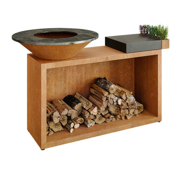 Présentation du braséro plancha OFYR Island 85 corten avec plan de travail en céramique anthracite :
