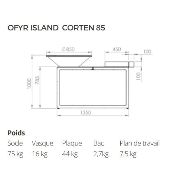 Présentation du braséro plancha OFYR Island 85 corten avec plan de travail en céramique anthracite :
