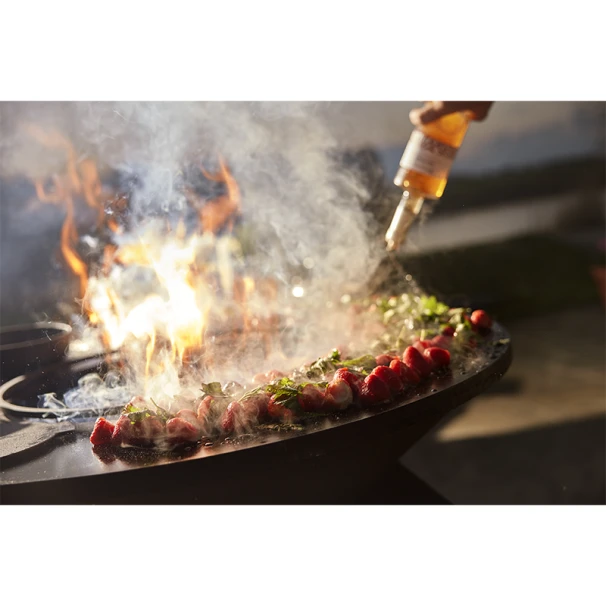 Sa plaque de cuisson en acier noir entourant le braséro permet à la plancha OFYR de vous offrir une surface de cuisson incomparable. On peut cuisiner chacun de son côté ses propres préparations tout en étant ensemble, ou bien confier la tâche à quelqu’un qui n’aura aucun souci à gérer les différents plats grâce aux différentes zones de cuisson.