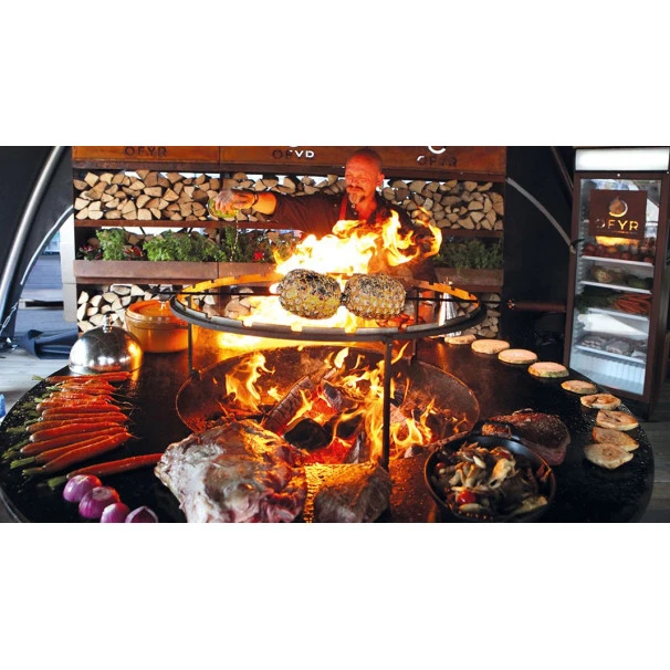 Le Braséro XL est un très grand modèle parfaitement adapté à un usage de restauration pour un grand groupe de personnes ! Tous les appareils OFYR ont été créés avec des caractéristiques techniques parfaitement adaptés à un usage professionnel. Avec son diamètre de 150 cm, sa plaque de cuisson offre un espace suffisant afin que deux chefs puissent cuisiner en même temps et servir 150 personnes. Pour une expérience encore plus diversifiée, une grille, un étouffoir et d’autres accessoires sont disponibles. Il s’agit là du plus grand braséro de la marque OFYR. Le modèle XL dispose d’une plaque de cuisson de 150cm de diamètre soit 50cm de plus que le modèle classique. Le braséro plancha XL c’est encore plus de convivialité pour encore plus de cuisiniers.