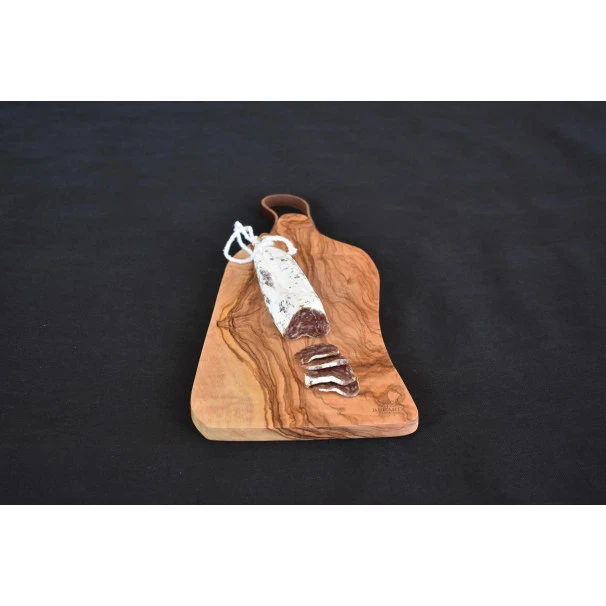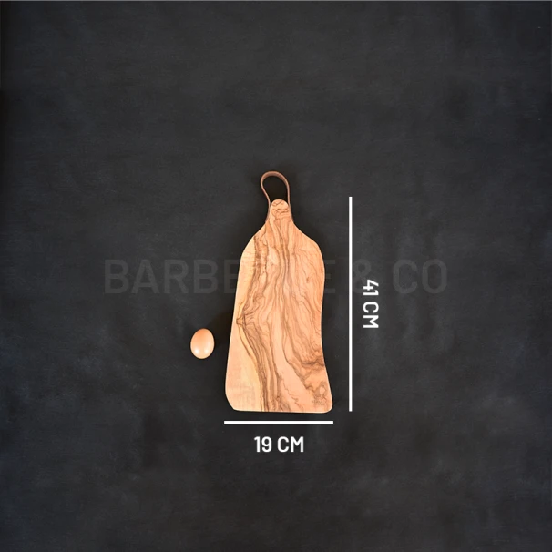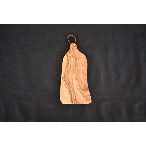 Cette planche se range facilement dans votre cuisine, se tâche peu et n’absorbe pas les odeurs. Elle est résistante et d’une grande qualité. Elle est en bois d’olivier et sa anse en cuir.