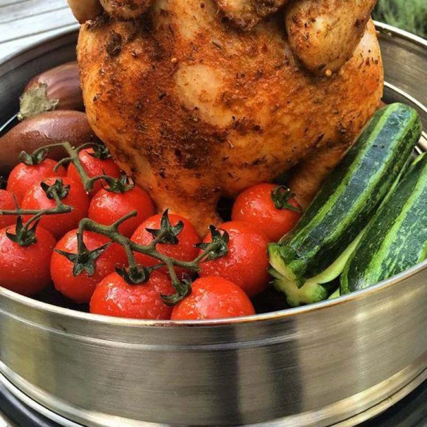 Rehausseur de couvercle pour cuisson de poulet ou grosses pièces de viande. L’extension de dôme vous permet d’obtenir plus de hauteur sous le dôme et donc de faire cuire des pièces de viande ou aliments plus volumineux. En acier inoxydable de haute qualité. Il est adapté au barbecue Cobb Premier.
