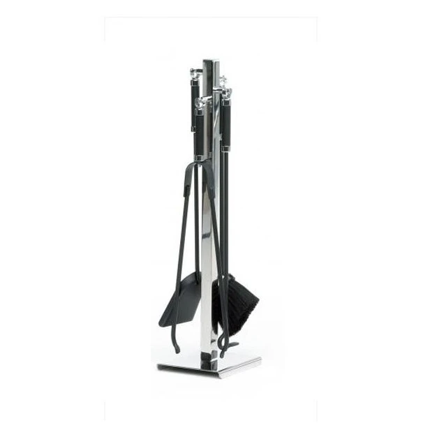 Le serviteur prend la forme d’une colonne carrée en inox avec un ensemble de crochets pour disposer les 4 accessoires (compris avec) pour l’entretien de la cheminée : pelle à cendres, balai, tisonnier et pince à bûches.